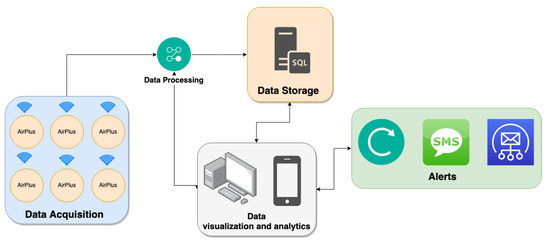 The AirPlus was designed to be used indoors with electricity source, therefore the authors do not spend efforts concerning the energy consumption and the incorporation of ultra-low-power sensors modules. The research was focused on real-time data collection, processing, visualization, analytics, and notifications.