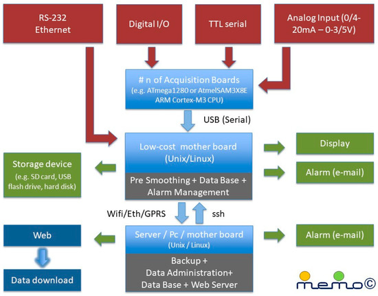 The system configuration shown in Figure 2 can be proposed for an industrial plant where the acquisition board connects directly to a server that communicates by an internal virtual private network (VPN), providing private data security (a good free solution is the use of FreeS/WAN). The certification of MEMO-HQ is not actually present as it also depends on the chosen HW.