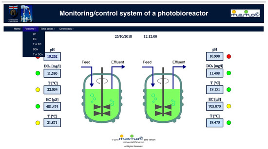Some panels from the web interface are shown in the following for the stirred tank reactors. In Figure 3, the home page with the schematic representation of the microalgae cultivation process in semi-CSTRs is reported. HQ-Pro is on-line with the alarms set by the user. The green light represents that the monitored variables are within the optimal operating ranges and the yellow and the red lights represent respectively, attention ranges and alarm ranges of the monitored variables. In the situation depicted in Figure 3, an alarm by email is sent to the selected email address for pH in both the reactors.