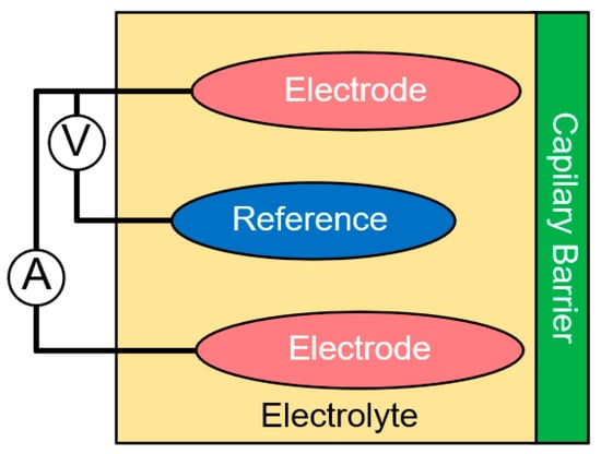 These sensors benefit from chemical reactions to sense a target gas where the product of the reaction and its speed is proportional to the gas target concentration. The materials used to compose these sensors have different target gases, depending on the temperature of the reaction. These sensors are basically composed of a membrane that separates the ambient gases from the electrolyte solution, the electrolyte, which is mainly composed by a liquid compound of acids or bases, and the electrodes that are consumed by the electrochemical reaction. The polarization of the electrodes and measurement of the variation of the output parameter is dependent on the sensing approaches, which could be potentiometric, voltametric, conductimetric, or amperometric. A filter, between the membrane and the environment gases, can be used to limit contact with unwanted gases, improving accuracy and sensitivity on these devices [31,90,92,115,116,117]. The representation of an amperometric electrochemical gas sensor is shown in Figure 2.