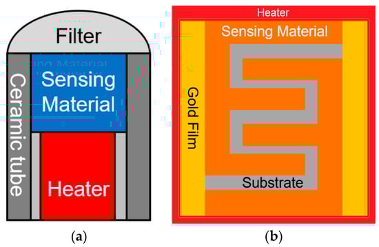 Illustration of metal oxide semiconductor gas sensors, where: (a) is a tubular metal oxide semiconductor (MOS) sensor, and (b) is a wafer MOS sensor.