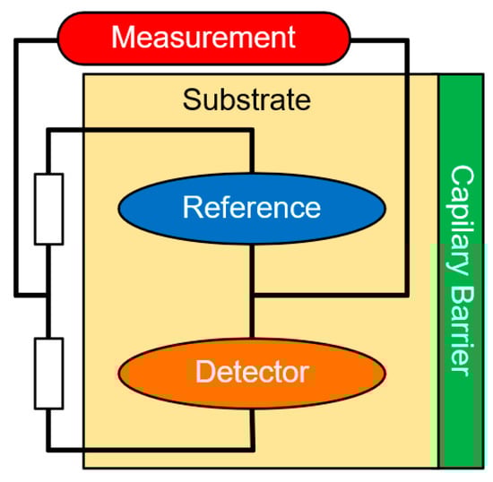 Catalytic gas sensors are composed of two semiconductor elements: a passive element, used as reference, and one active element that reacts with the target gas, generating an elevation in the temperature and, thus, generating a variation in the internal resistance. The reaction between the target gas and the catalytic element is responsible for the consumption of these kind of gas sensor, and the exposure of catalytic gas sensors to concentrations above the upper flammable limit will deteriorate the catalytic element, therefore, the sensor will lose its capacity to detect the target gas, providing invalid results [126,127,128]. Figure 4 shows the concept of the catalytic gas sensors. The target gas burns the detector material, elevating the temperature, and thus, the internal resistance, allowing measuring the target gas’ concentration.