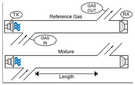 Sound propagates differently depending on the propagation medium: in gases, the ultrasonic speed is a function of the temperature, pressure, humidity and the gas mixture properties. Taking advantage of these characteristics, acoustic waves can be used to determine whether a gas is present in the ambient or not. The analysis of the gases can be performed by the speed of the sound, by the attenuation of the signal, the acoustic impedance, or the combination these characteristics [28,31,99,135]. Figure 5 shows the schematic used in the acoustic gas-sensing approaches.