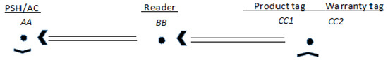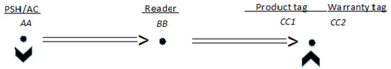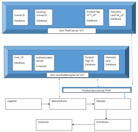 - The product service hub (PSH), see Table 2, which is an intermediate server connected to both the AC and the anti-theft (AT) servers, is accessible by any reader with a correct to prevent the use of unauthorised or malicious applications. The reader is a device used by the customer or any Supply Chain (SC) entity and can be a smartphone with the authentication protocol downloaded from the PSH; only readers with this application can check and verify whether the product is genuine;