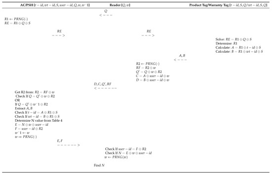 Table 4. N Value.If all the elements , and S match the record, then it responds with signifying that the product is genuine to the PSH; if the or the secret S is not correct, the server responds signifying that the product is not genuine. If the is missing or 0, the PSH replies or tag missing. Then, it calculates E and F from Equations (9) and (10) and generate a new w before updating w(−1) with w and sending E and F to the reader; - Step 6: in this step, the reader checks if = , and if N = , then it updates the w.
