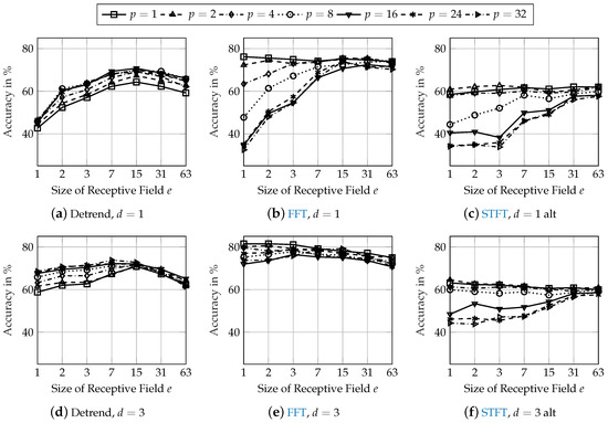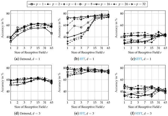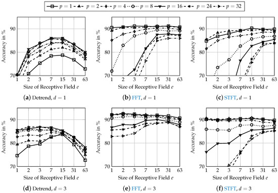 Similarly to FFT input data, the amplitudes at different frequencies are available in the STFT input data with additional time-relation information. Therefore, the behavior of using STFT input data is similar to using FFT input data. Small sizes of the pooling layer result in the best accuracy. A greater size of the receptive field increases the classification performance, especially for large sizes of the pooling layer. Even a receptive field that is larger than the actual input data () results in accuracies similar to those of smaller receptive fields. However, this increases the number of trainable parameters and is therefore of no further benefit.