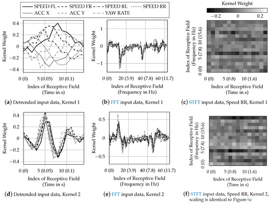 Figure 6c,f visualizes the kernel weights for the rear right speed signal for a network with STFT input data. Aside from noise, noteworthy characteristics are dark horizontal lines. This demonstrates that this CNN performs analyses similar to the CNN using FFT input data by analyzing for amplitude differences at different frequencies independently from the time information on the x-axis. With the input data resolution of 32 pixels, the frequency resolution is