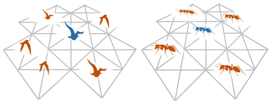 As an alternative to a wired sensors network for smart structures, wireless sensor networks (WSNs) have attracted several researchers []. With lower cost, an array of WSNs can effectively be used for monitoring the structural deterioration, as well as controlling vibration during an earthquake, by using artificial neural networks [,]. The data that is acquired using WSNs is essentially the same as the traditional counterpart that has been challenged recently due to deployment difficulties, as well as reliability issues during an extreme event. Nowadays it is feasible to mimic the swarm behaviors in nature and share important response data with the adjacent buildings using a wireless sensors network and via cloud-based computing []. Keeping this in mind, the idea of swarm-based parallel control (SPC) of such buildings is proposed in this paper. With this approach, the response data from each wireless sensor is transferred to the adjacent buildings to update the responses without physical structural links. Figure 1 illustrates such information flow that is inspired by nature. Using the similar concept for adjacent buildings, the control force can be determined for each building with respect to the other surrounding structures, meaning that using the proposed algorithm, the optimal control forces are first determined based on the response of each building individually, and then, it is modified based on the responses of the other adjacent structures. In this study, the fuzzy inference system (FIS) is used to interpret the data using nonlinear mappings. The nature-inspired information flow among the swarms can be seen in Figure 1, while the information flow between each adjacent building is illustrated in Figure 2.