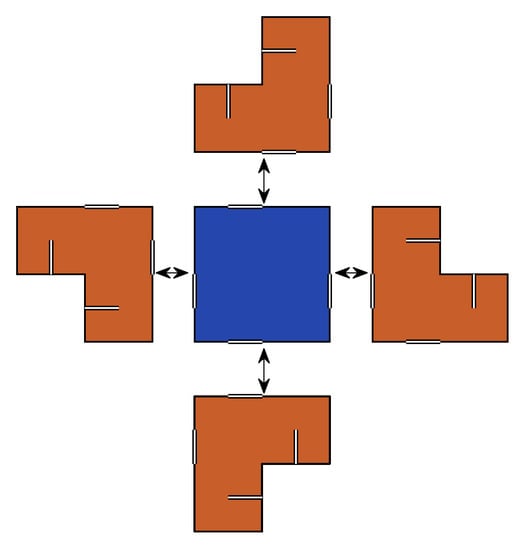 Figure 4 shows five adjacent buildings with different dynamic properties. Instead of coupling buildings (Case-II), response data is shared among the controllers. Thus, an additional control fuzzy logic control layer is considered to avoid pounding, for which the input variables are the relative displacements and the directions. Using this strategy, the optimal required clearance distance can be decreased, which is critical in urban areas, where the cost of space and material is essential. Using this method, the adjacent buildings are not connected physically, and the response data are shared wirelessly. Thus, buildings are independently controlled, and then their relative performances are evaluated using a second fuzzy logic control algorithm. In this paper, the first fuzzy logic control, FIS1, determines the control forces for individual buildings independently, and the second fuzzy logic control, FIS2, determines the control forces based on the relative motions including the torsion in each irregular building. Finally, the optimal MR dampers input voltages are selected by comparing the outputs of FIS1 and FIS2.