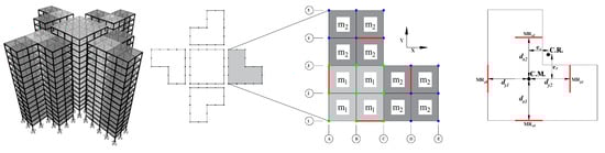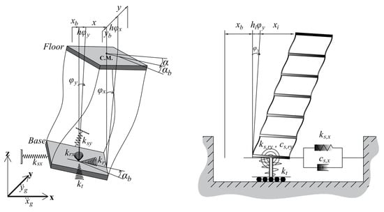 Figure 3 shows a multi-story shear frame building considering the soil–structure interaction simulation. In three-dimensional space, a building can be idealized as a (3 × n Story + 5)-DOF system. This is because each story has three degrees of freedom, plus five degrees of freedom for the base of the structure, swaying motion in the x- and y-directions, rocking about the x and y-axes, and twisting about the z-axis. As shown in Figure 3, pairs of dashpots and springs are defined to consider the SSI effects in the simulations. In this figure,  denotes the base displacement,  represents the rocking motions about the y-axis, and the relative displacements of stories are shown as . Note that the settlement in the z-direction is not considered, and the twisting motion is not visible from the side view.