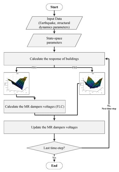 For Case-I, the behavior and control of a single building (in the east, Figure 4) are studied considering the soil–structure interaction (SSI) effects, and the performance of the different control algorithms are compared when the behavior of the adjacent structure is neglected. The response reduction ratio is considered as the performance index, and since the active control has a different control mechanism, the ideal condition is considered for this study. The linear quadratic regulator (LQR) algorithm is used for calculating the optimal control forces that can be applied to the structure through pairs of active tendons that can be installed at the same locations as for the MR dampers. Therefore, the advantages of FLC and SPC are not compared to the active control system. The fuzzy logic control (FLC) is used to efficiently control vibrations using semi-active MR dampers, which is illustrated in Figure 5. More details, and the background of LQR and FLC algorithms are available from refs. [,,]. The weight matrices for the LQR method are selected as , and , where  is an identity matrix.