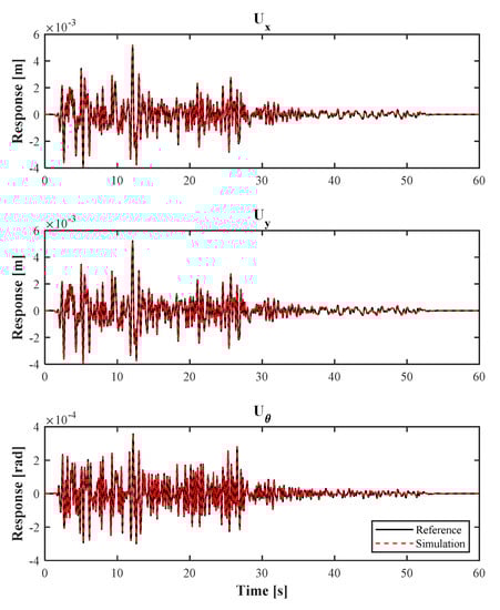 It should be noted that the above-mentioned equations are in the continuous-time format; however, for the simulation with Matlab software, they are converted to the discrete-time format. A step-by-step procedure for computing the response of the system in the discrete-time domain is presented in the reference book by Cheng et al. []. The ground motions coefficients are given in  for two directions, and the coefficient of the input controlling forces on each degree of freedom, including rotation, , can be described using the  matrix as [,]: