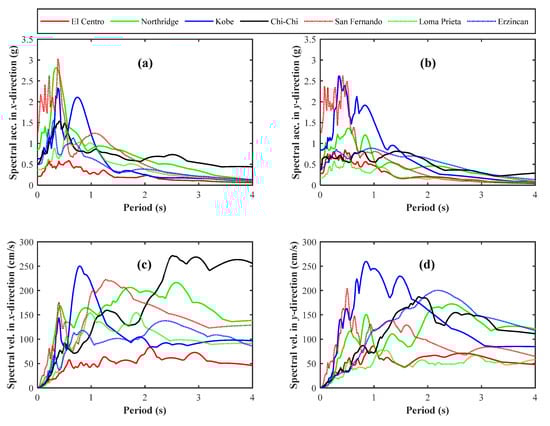 Spectral acceleration, (a) and (b), and spectral velocity, (c) and (d), of the selected earthquakes in two directions.