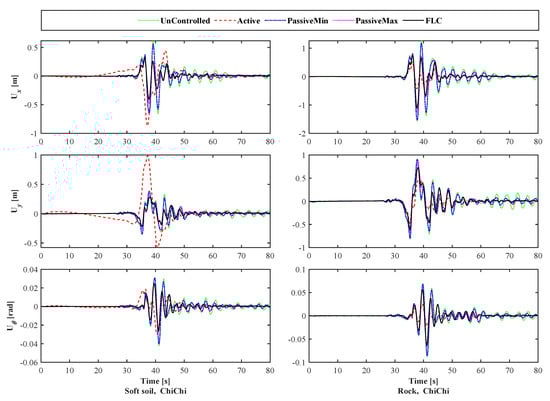 The time-history responses provide a tool to understand the performance of any techniques during a seismic event []. Figure 11 shows the top floor displacement time-history in the x-, y-, and θ- directions for the Case-I building considering SSI under the Chi-Chi earthquake. It is clear that the designed active control for a building on a rock base does not necessarily have similar performance for the same building, but on a soft soil base. This different behavior shows the sensitivity of the active control system, as well as the reliability of the FLC method. For all the seven earthquakes, the FLC provided a better performance with and without considering SSI. Another important fact, evident from the peak responses table and the time-history curves, is that for those buildings on a soft soil base, the peak responses are smaller. By implementing a properly designed FLC, the overall response can be reduced by 40% and 50% for near- and far-field earthquakes, respectively [].