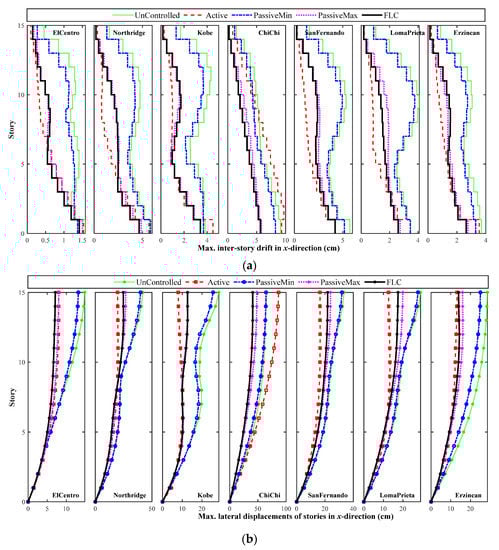 The inter-story drift profiles are typically used as a measure for the optimal placement of control devices, as well as estimating the potential damage locations. Smaller inter-story drifts, on the other hand, indicate that linear control algorithms can be satisfactory. Furthermore, P-Δ effects are reduced by decreasing the inter-story in the lower levels of a multi-story building. Smaller inter-story values for top floors makes it reasonable to use twin tuned mass dampers (TTMDs) instead of semi-active dampers, since the performance of semi-active devices is directly related to the relative displacement and velocity []. Figure 12 and Figure 13 show the maximum inter-story drift profiles for the Case-I building in x-direction, under the bidirectional earthquakes loads. For this specific example, the active control using LQR algorithms shows a better performance in most of the cases.