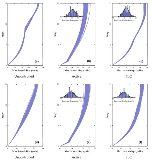 Maximum lateral displacements of the Case-I building considering uncertainties in dynamic properties (soft soil). (a) and (d): Uncontrolled; (b) and (e): Active LQR; (c) and (f): FLC.