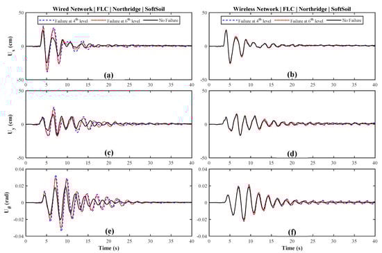 One of the main drawbacks of the traditional wired sensor networks, is that they are not always reliable in case of fire, or due to the failure of signal lines at lower floor levels under large deformations. On the other hand, IoT and cloud-based computation, along with wireless sensor networks, make each device independently controllable and more reliable. The effect of the failure in the signal line in the traditional wired and wireless network are compared in Figure 15. In the wired sensor network, expecting that the main controlling computer remains safe and secured during an earthquake, the signal line is assumed to be broken at either the 4th or 6th floor, which would put the upper floors controlling devices in passive-min mode. However, using the IoT concept with a wireless sensors network, only the specified floor dampers are removed from the control algorithm. The overall structural responses of the building on the top floor in x-, y-, and θ-directions using the FLC indicate the superior performance of a wireless sensor network as part of the IoT. Comparing the responses also reveals that placing MR dampers at the first lower floors offers more resistance and damping during an earthquake, which is reasonable referring to the inter-story drift profiles.