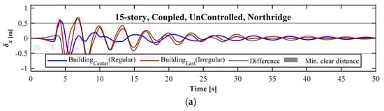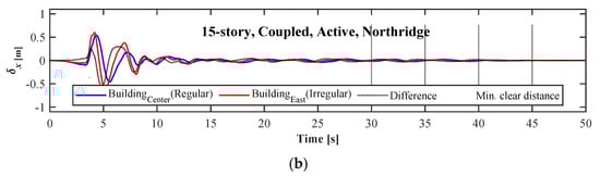 Design of a vibration control algorithm, when at least one of the two adjacent buildings is irregular, is a challenging task that needs knowledge and experience. To reveal one of the main challenges of designing an active control using active tendons to couple two buildings, which includes the optimal selection of the weights, the vibration responses of the two adjacent buildings, in the east (irregular) and the center (regular), are given in Figure 16. As it is clear from the figure, under the Northridge earthquake loads, the vibration of both buildings decreases significantly, as well as a considerable decrease in the minimum clear distance between the two buildings, considering the irregularity. These results are obtained when the parameters of the LQR algorithm is selected by an optimization technique. With this technique, the irregular building in the east passes a portion of lateral loads to the regular building to reduce the overall response of both, which can be seen from the results that indicate a minimum reduction in the peak displacement in the directions to the adjacent structure.