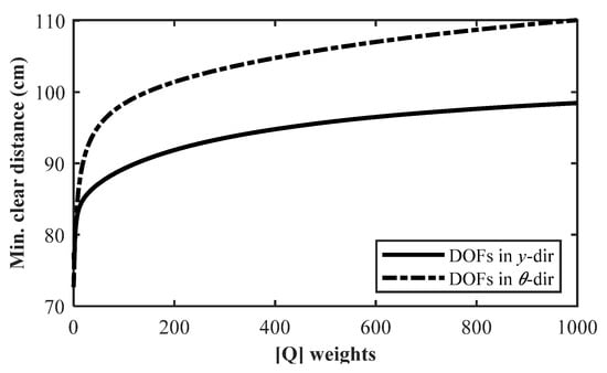 Minimum Clear distance required to avoid pounding using active control with respect to different response weights.