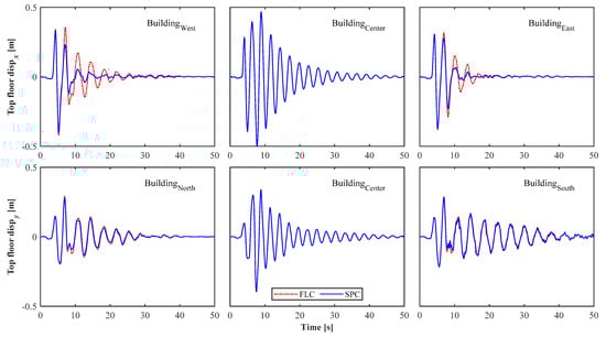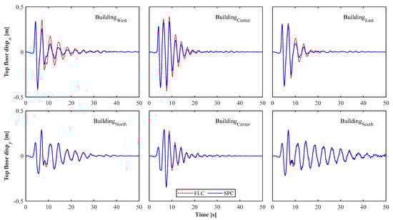 In this paper, four adjacent 15-story irregular steel frame buildings were designed and simulated in MATLAB® (MathWorks, Inc., Nattick, MA, USA), based on the studies carried out by Kaveh et al. [] and Azimi []. The 3D and plan views of the structures, as well as the mass and stiffness distributions, are visually illustrated in Figure 4. Two groups of columns, with the same stiffness in both directions, are connected rigidly to the floor diaphragm frames,  Kn/m. Each floor consists of 5 × 5 m2 slabs that carry loads of  (kN/m2) to simulate the eccentricity. Each story has a height of 3.0 m, except the first story, with a 3.2 m height. The four dampers of each floor are placed within the frames shown with red bold lines. To ensure the accuracy of the simulation results, the building model simulation is verified, based on the study by Nazarimofrad et al. []. Figure 8 shows the top floor level response of the 10-story building model under the same ground motion, which indicates that the simulation results in this study are valid.