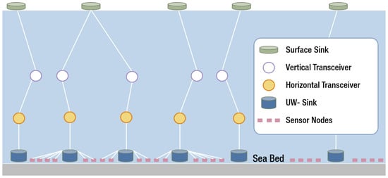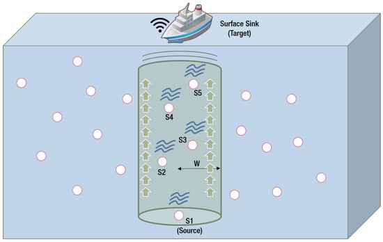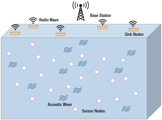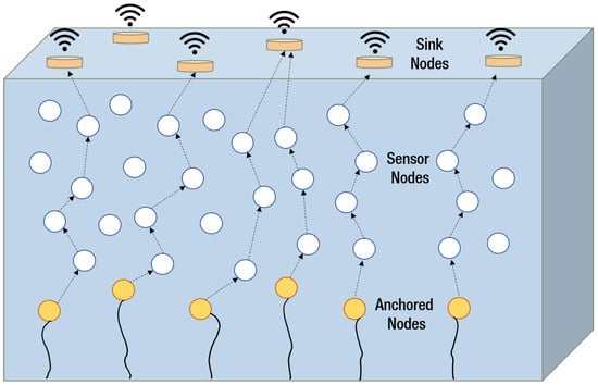 This underwater wireless sensor network is different from the traditional wired and wireless terrestrial sensor networks [,]. UWSN is composed of a different number of sensor nodes which are deployed at different heights/depths of the sea volume. The number of sensor nodes depends on the volume of the sea that is to be covered and other factors such as the transmission range of the nodes, the desired performance of the network, and so forth. These sensor nodes at different levels of the sea collect the necessary data and eventually send it to the data sinks at the sea surface. These data sinks send the collected data to the nearest terrestrial network by satellite or Radio Frequency (RF) communication. The data transmission from the surface sink to the terrestrial network follows the traditional protocols for terrestrial communication.
