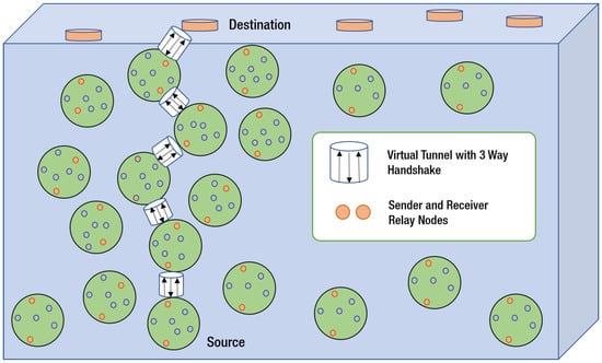 The figure shows that a virtual tunnel is formed from source to the destination. This tunnel transfer the data from one cluster to another depending on its distance to the sink. This follows three-way handshake between the relay nodes. Due to the thee-way handshake and tunnel formation, a strong link is formed from the source to the sink (destination). Authors showed that, VTP gives better result in Packet Delivery Rate, latency and number of hops in compared to the Channel Aware Routing Protocol (CARP) and multi-level Q-learning based routing protocol- MURAO [,]. But this protocol do not show any results on energy-efficiency, reliability and overall performance. Moreover, VTP might not be energy conservative as it performs three-way handshake for single packet transmission.