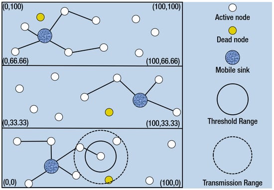 Data transmission of VSM is depicted by Figure 13 which shows that the whole network area is divided into 10 equal parts. Sensor nodes are placed arbitrarily over the whole volume. Three mobile sinks are employed for the whole volume of the area with a predefined distance from each other to maximize the coverage area. These sinks take a new position in every round in such a way that they maintain this predefined distance from each other. When one round ends sink one take a new position by traveling a preset distance in X or Y axis. Sink two traverse the same distance in same direction of the same coordinate to maintain that predefined distance. Similarly Sink three take position depending on the position of the sink two. To transmit data packet, every node calculates its distance with the sink and neighboring nodes. If it finds one or more sinks within its transmission range, the node directly transmit to the sink. If all of the sinks are out of the range, the sending node tries to find a neighboring node who has a sink within its range. In this case, the neighboring node transmit the received data from sending node to the sink. But unfortunately, if there is no eligible neighboring nodes even, then the data packet has to be discarded.