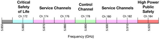 As shown in Figure 1, the DSRC spectrum is arranged in seven 10 MHz channels. The guard band is 5 MHz; i.e., a part of the DSRC spectrum not employed to prevent interference. Channel 178 (5.885–5.895 GHz) is reserved solely for safety communications and is termed the control channel (CCH); it carries the most critical alarms and beacons. It is the unique channel shared between all the WAVE devices, and consequently, constitutes a joining point between the nodes. The two channels at the edge of the spectrum are reserved for prospective applications and particular employment, such as advanced accident prevention and public safety uses. The remaining channels are service channels (SCH) for the residual applications and regular communications. Pairs of these adjacent channels can also be blended in a 20 MHz channel. Nevertheless, the necessity to have 10 MHz channels is associated with the use of parallel applications, and as a consequence, the partial reduction of channel congestion. Besides, physical tests prove that 10 MHz channels are more suitable both for delays and the Doppler effect ascertained in vehicular environments. The DSRC band is subject to limitations and governed by several rules, such as the application of a specific one standard, unlike the Industrial Scientific and Medical (ISM) bands (900 MHz, 2.4 GHz, and 5 GHz) which are not licensed.