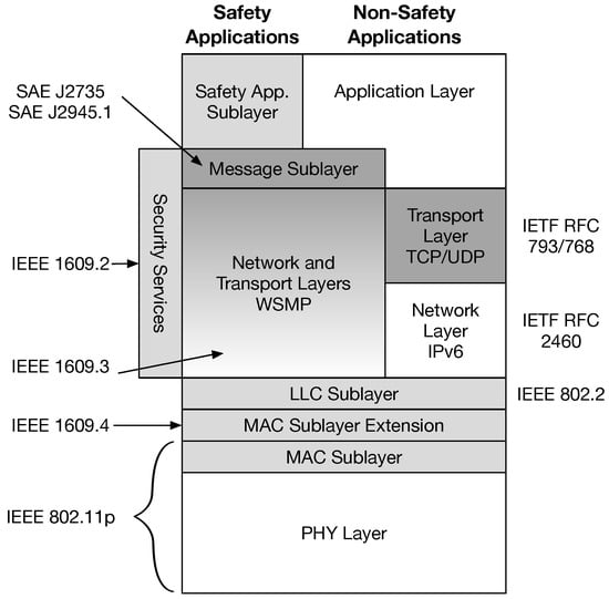 In the DSRC architecture (Figure 2), each layer practices different protocols. For the PHY and MAC layers, the IEEE 802.11p is adopted, while at the upper layers the IEEE 1609.2, 1609.3, and 1609.4 protocols are implemented, each of which deals explicitly with some services. In particular, they are respectively: security services (1609.2), network services (1609.3), and channel switching (1609.4). In the network layer, the WAVE Short Message Protocol (WSMP) is employed, but, as shown in Figure 2, depending on the application, it is also permissible to utilize other protocols, such as IPv6, TCP, and UDP.