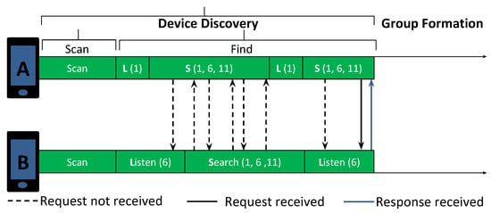The connection establishment is composed of two main procedures: device discovery and group formation. In the device discovery, the goal is to detect other nodes within the communication range. This is done in two phases: Scan and Find. During the Scan phase, the device senses all available channels (1 to 13) for other nodes, groups, or traditional Wi-Fi networks. In the Find phase, the node transmits (Search) Probe Requests on the social channels (1, 6 and 11), and listens (Listen) to one of these channels waiting for Probe Requests. The nodes alternate between the social channels defined in the Search and Listen steps, persisting a certain time (100, 200 or 300 ms) on each channel, until they discover another node. The connection is established only when two nodes synchronize on the same channel. For example, in Figure 1, node A discovers node B only when node A transmits Probe Requests on channel 6, which had been selected by node B in the Listen step. This is the main cause of the long delay in the connection establishment time.