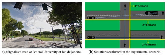 In this work, we conducted real and simulation experiments to, first, evaluate the impact of the CET in V2P scenarios and, second, to evaluate the improvements achieved with the use of beacon stuffing []. In the real experiments, the performance analysis of Wi-Fi Direct is evaluated taking into account a pedestrian carrying a smartphone (as a member of the communication group) as well as a vehicle containing a smartphone (GO). The same elements are modeled in the framework INET of OMNeT++. The assessment scenarios are based on a signalized road (Figure 2a), where pedestrians can cross while vehicles wait for the traffic light to go green. In the real world, in many countries, pedestrians crossing with the traffic light green to vehicles is a common situation, which puts pedestrians and drivers at risk. Over 80% of fatalities involving pedestrians occur during a crossing attempt []. This situation is impaired by obstacles, such as a bus collecting passengers, since most VRU detection systems (such as sensors and cameras) require LoS conditions to work properly []. In the case of VANETs, obstacles lead to the obstruction of the radio signal propagation. Besides that, there is also the blocking of the pedestrian’s visual field, who may not perceive the arrival of vehicles when trying to make the crossing with the traffic light open. In this context, three scenarios are defined, as Figure 2b illustrates.