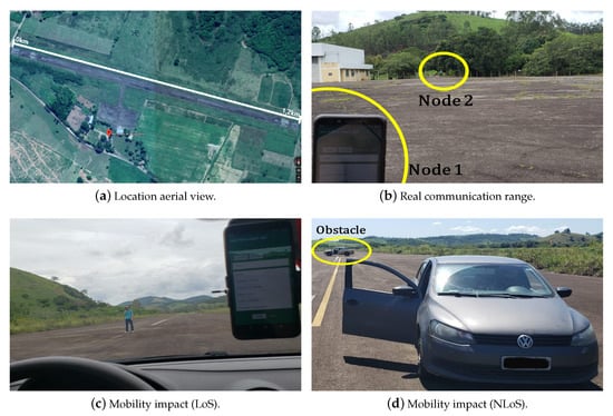 Other parameters of the real experiment that must be noted are as follows. With 80 bytes, the BSMs are transmitted periodically every 100 ms. It should be noted that the windows of the vehicle remained closed during the communication with the pedestrian. The real experiments were carried out in a deactivated airport located at Leopoldina—MG, Brazil. Because it is located in a rural area, this place does not receive interference from cellular or Wi-Fi networks, making it ideal for carrying out the real experiments. Besides that, as it is located in a predominantly open area without buildings, the evaluation under LoS conditions is possible. Figure 3a shows the aerial view of the airport, while Figure 3b–d show the devices used and the evaluation in progress, respectively.