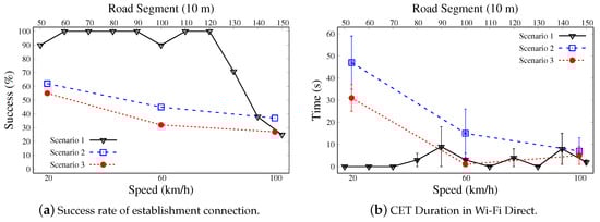 It is worth highlighting the impact of the long CET of Wi-Fi Direct. In many rounds, it is not possible to establish a connection between the nodes. Thus, the results in this section are based on the rounds where the connection is established. We run the simulation until 10 successful rounds are achieved for each experiment. Figure 4a shows, for each scenario, the success rate taking into account the ratio between the 10 successful rounds and total number of simulation runs for each experiment. For example, in the simulations of the 1st Scenario, at 150 m, 40 executions are necessary to establish the connection in 10 of them, generating a success rate of 25%. As can be seen, in more distant road segments (1st Scenario), higher speeds (2nd Scenario and 3rd Scenario) and NLoS conditions (3rd Scenario) it is more difficult to establish a connection. These results demonstrate the challenge of using Wi-Fi Direct in mobility scenarios.