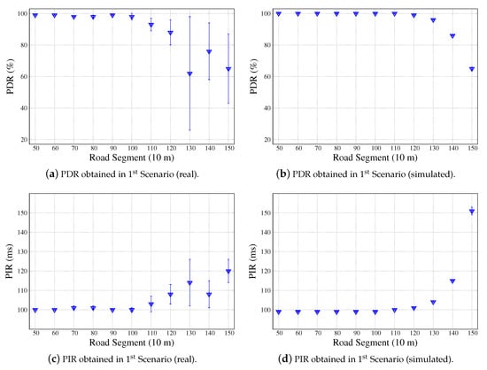 As mentioned in Section 4, the results of this first set of experiments are used as a reference to the calibration step of the INET propagation model, bringing the simulated environment closer to the real world. The calibration process consists of obtaining, in the road segment that corresponds to the distance of 150 m among the nodes in simulations, a PDR similar to that one obtained in the same road segment in real experiments. After this procedure, we investigate the equivalence of the results in both environments. Besides that, this assessment also serves to analyze the real communication range of Wi-Fi Direct in the real world. Before considering Wi-Fi Direct in the vehicular environment, it is necessary to analyze whether the devices are able to communicate at the distances defined in the application requirements. For example, blind spot and lane change warnings operate within 100 m []. Figure 5a–d show the real range of Wi-Fi Direct based on PDR and PIR as the distance between the nodes increases.