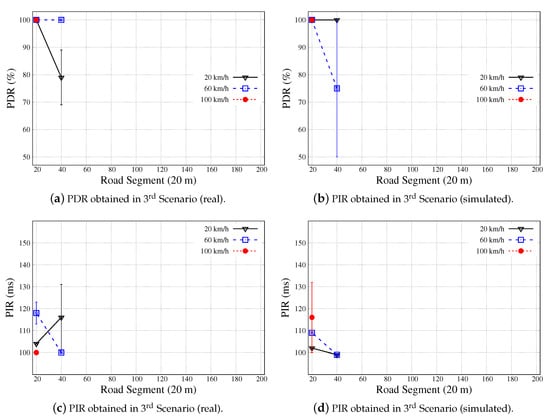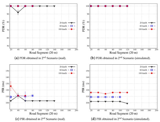 With regard to PIR, Figure 7c shows, once again, a slight correlation with PDR in real experiments. On the other hand, as Figure 7d shows, the simulations do not show correlation between the two metrics. Nevertheless, the trade-off between increasing vehicle speed and increasing PIR remains in simulations. Finally, despite the reduction in PDR, in both environments, in the segment between 20 to 40 m, the PIR remained proportional to the generation period of BSMs.