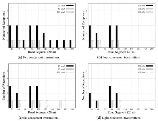 In order to evaluate the transmission based on beacon stuffing in an environment with interference, four simulation scenarios—varying the number of transmitters (GO) transmitting beacons periodically on the same operation channel—are executed. In all cases, there is only one node modeled as a vehicle (receiver). The results show the number of BSMs received in each 20 m segment, based on the BSMs transmitted by the pedestrian (GO) located closest to the obstacle. All pedestrians (the GO located closest to the obstacle and others acting as interference) are positioned 3 m away from each other. Figure 8a–d presents the number of receptions in the scenario with NLoS conditions and interference. Ten rounds are performed for each scenario evaluated.