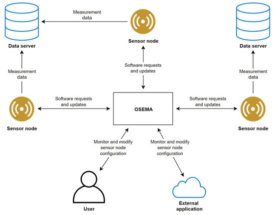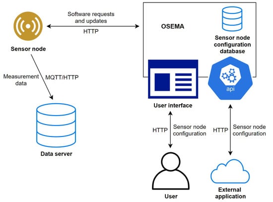 OSEMA allows the management of sensor nodes remotely over the Internet and the quick setup of the nodes via software generation. To collect data, the sensor nodes and data server(s) are also needed, as shown in Figure 3. The configurations of sensor nodes are stored in the database of OSEMA and can be modified via the REST API and web user interface. If a node configuration is modified, OSEMA generates a new software based on the new configuration. Sensor nodes request these software updates from OSEMA periodically over HTTP. The measurement data are sent over HTTP or MQTT (Message Queuing Telemetry Transport) to an external data server.