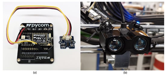 A sensor node consisted of a microcontroller and a sensor (Figure 2a). The microcontrollers used were based on the Espressif ESP32 chipset, and they had built-in Wi-Fi and Bluetooth. The microcontrollers were selected from PyCom, because they offered boards also with built-in NB-IoT (Narrowband IoT), LoRa (Long Range), and Sigfox. This would allow implementing support for several different networks in the future.