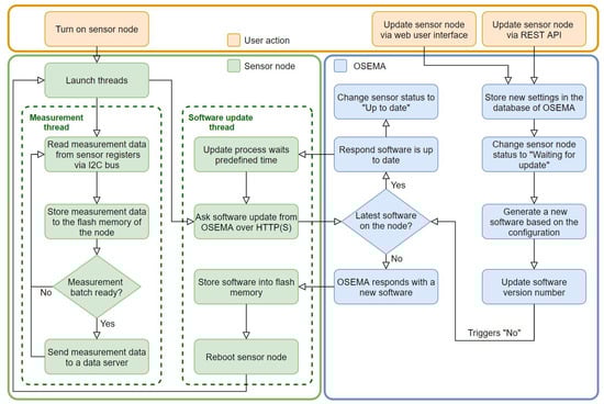 The software update process and how user action triggers a software update are illustrated on the right side of Figure 4. A sensor node periodically asks for updates from the management system with an HTTP request containing the current software version of the node. OSEMA compares this version number to the newest software version in its database and either responds with new software in the payload of the response or confirms that the sensor node has the latest software version. If new software is received, the node writes it to its flash memory and reboots. In the boot-up, the node replaces the old software version with the new one.