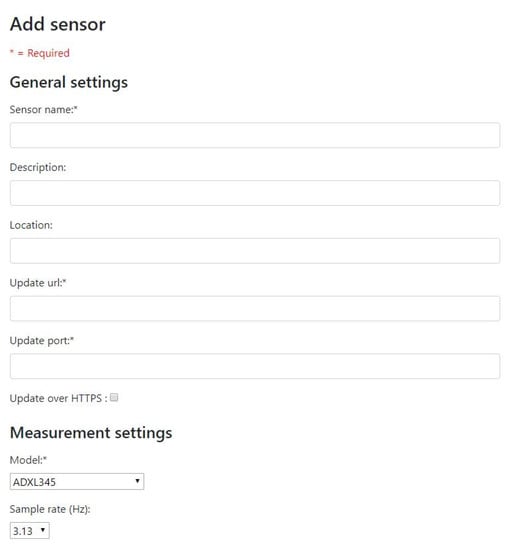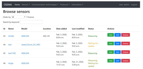 OSEMA has a web user interface, which allows managing sensor nodes. Figure 5 shows the browse sensors view, which lists all sensor nodes in the manager. In this view, the statuses of sensor nodes can be monitored, and their configuration can be changed by selecting the edit button. When a sensor node is added (Figure 6), it is configured according to the list presented in Table 1. In addition, a description and location of the node can be defined.