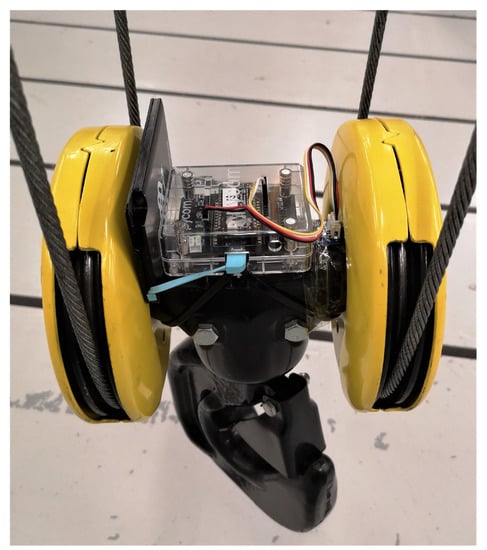 The driving style of an overhead crane affects the lifetime of the components. For example, compared to moderate accelerations, rapid ones yield larger forces that wear components faster. A rough driving style also increases the risk of accidents. Thus, a system for estimating the usage roughness of an industrial overhead crane, Ilmatar [] (Figure 7), was developed. The movement of the hook was measured with a three-axis accelerometer (Figure 8), which sent sensor readings constantly to an externally managed IoT platform via MQTT. The platform then calculated the usage roughness index from the measurement data using a machine learning algorithm, which was also implemented by the same external party. The operator of the crane received feedback on the driving style with a simple gauge. Figure 9 shows the interaction between entities in the usage roughness estimation application.