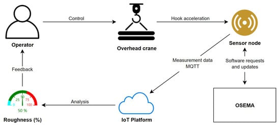 The application was validated by operating the overhead crane with different driving styles. The tests indicated that even a simple measurement setup was able to distinguish rough driving from the normal use of the crane. However, modern cranes have built-in anti-sway control and automatically limit maximum acceleration, which reduces the usefulness of the application. These features already restrict the roughness of the driving and must be turned off to yield a high roughness index. The use case showed that OSEMA allowed rapid application development even remotely. The configuration of the node could be changed easily and would be possible even by the algorithm developer if the measurement data were inadequate. Compared to other systems, setting up the measurement was swift and easy, since the three-axis accelerometer was already configured to OSEMA, and manual programming was not needed. In addition, changing the sensor measurement settings was quick, which allowed experimenting with various sample rates.