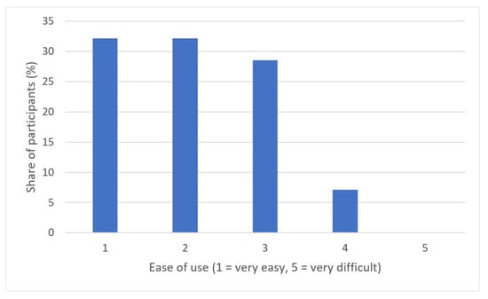 A total of 49 students participated in the laboratory exercise, and 42 of them worked in pairs. Thus, the number of responses to the feedback questionnaire was 28. On average, it took 27 min 45 s from starting the exercise for measurement data to appear on the data server. The questionnaire results showed that OSEMA was considered reasonably easy to use (Figure 10): the average rating for the ease of use was 2.11 (1 = very easy, 5 = very difficult). Most problems encountered during the tests were related to moving the files from a laptop to the microcontroller because the files could not be renamed or deleted after they had been transferred to the microcontroller. Therefore, if the wrong file was uploaded to the microcontroller, all files had to be removed using the firmware update tool. This negatively affected the workflow, but could not be fixed with OSEMA, since the problem was caused by the microcontroller firmware.