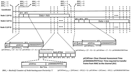 - Successful transmission: When the backoff counter of a node becomes zero, the node waits some time as specified in equation 4, then it starts transmission. In addition, when the backoff counter of two or more nodes with different UPs becomes zero, the node with a higher UP starts transmission after waiting for its , as shown in Figure 1. In Figure 1, three nodes have UP 6, 5, and 0, along with a coordinator. Initially, the backoff counter of a node belongs to UP 6, 5, and 0 is set to 2, 3, and 3, respectively. After two backoff slots, the UP 6 backoff counter becomes zero. Thus, it starts transmission after waiting for its as given in Equation (4). The of any node is smaller than the backoff slot. After successful transmission by a node of UP 6, all the nodes resumes the process of backoff and decrements its backoff counter. Subsequently, the nodes with UPs 5 and 0 backoff counter becomes zero. Both the nodes must wait for their , but based on equation UPs have lower and start transmission. Node with UP 0 found the channel busy as it has bigger as compared to UP 5, so it does not transmit and choose its backoff counter again based on its current CW.