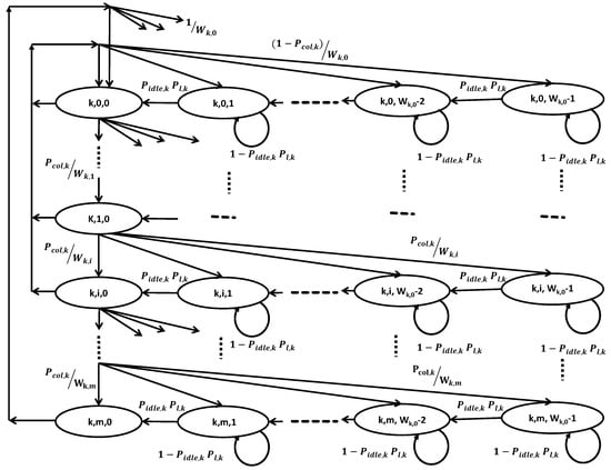 To analyze the performance of IEEE 802.15.6, we consider discrete-time Markov chain (DTMC), as shown in Figure 2 by following the well-known models given in [7,20,29,30]. We compare the analytical model that depicts the mechanism of IEEE 802.15.6 CSMA/CA under steady-state conditions. The nodes are divided into classes based on user priorities denoted by i, where and classes are differentiated by and . The IEEE 802.15.6 MAC superframe structure consists of different access phases. For simplicity, we only assume mechanism in the Random Accesses Phase 1 (RAP1) and neglect other optional access phases. Furthermore, we assume an ideal channel in which packets subject to collisions only.