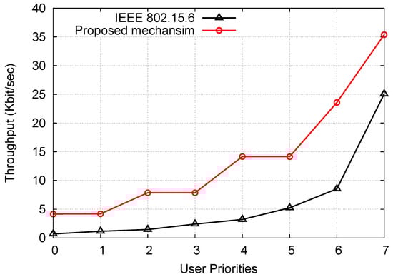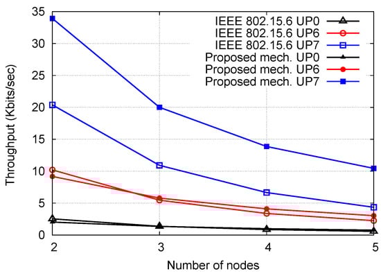 Figure 3 and Figure 4 show the throughput of IEEE 802.15.6 and proposed mechanism for Scenario 1 and Scenario 2, respectively. In Figure 3, the throughput of all mechanisms decreases with the number of nodes due to the increase in contention and channel shared among the increasing number of nodes. For UP 7, the throughput of the proposed mechanism is improved by 1.66 to 2.08 times for varying the number of nodes. The outstanding performance of the proposed mechanism is due to avoiding retransmissions for higher priority nodes. The proposed mechanism avoids collisions among different UPs by employing a differentiated and a proactive approach to reduce contention between nodes with a similar UP. However, for the lower priority nodes, the proposed mechanism performs similar to the IEEE 802.15.6 standard. The rationale behind this performance is when the backoff counter of two different priority nodes become zero at the same time, the node with higher priority has a better chance to access the channel while the lower priority one follows the backoff process using ABEB.