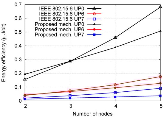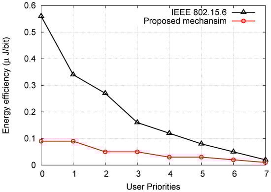 Figure 6 shows the energy efficiency for the proposed mechanism and IEEE 802.15.6 standard for Scenario 2. We can see from the figure that a lower priority node has higher energy efficiency, and a higher priority node has lower energy efficiency. This is due to the fact that a lower priority node sends fewer bits and due to the contention process. Also, we can see that the energy efficiency of every UP in the case of the proposed mechanism is decreased as compared to the IEEE 802.15.6 standard. For all UPs, on average, the energy efficiency decreases by 3.75 times due to collision avoidance in the proposed mechanism.