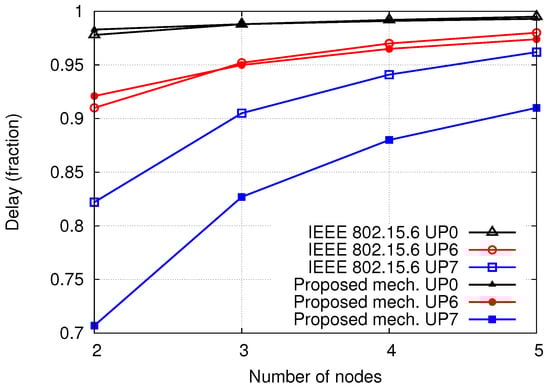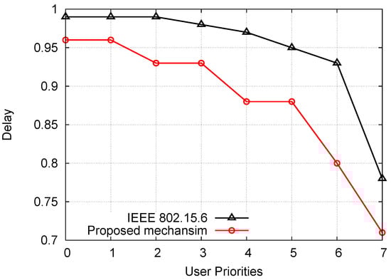 Figure 8 shows the normalized average delay for the proposed mechanism and IEEE 802.15.6 following Scenario 2. It is important to note that for the proposed mechanism, some UPs have the same normalized average delay because they have similar minimum CW. In addition, in the proposed mechanism, there is no collision among/between nodes of different UPs. Also, for all UPs, the proposed mechanism has better performance than the IEEE 802.15.6 standard.