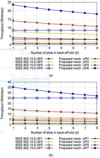 Figure 9 shows the throughput for the value of ranges from 1 to 8 for 3. As we know in Scenario 3, we have a node from every UP; however, for a better presentation of the results, we show the results in two figures. As we can see, the performance gain of the proposed scheme decreases as we increase the value of , but still, it is better than the IEEE 802.15.6 standard. For UP 6 and UP 7, the throughput is equal to 8.54 kbps and 25.07 kbps for IEEE 802.15.6, and on the other hand, for these two UPs, the throughput of the proposed mechanism for is 23.59 kbps and 35.38 kbps, respectively, and for is equal to 18.08 kbps and 27.13 kbps, respectively. We can see that there is a significant gain for both small and large values of .