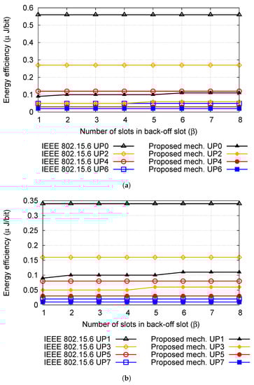 Energy efficiency (Joules/bit) is quite demanding in the IEEE 802.15.6-based WBANs and therefore we also derive equations for (i.e., the energy efficiency of UP k) as: